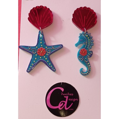 Pendientes estrella y caballito de mar con concha todo en metacrilato y plata